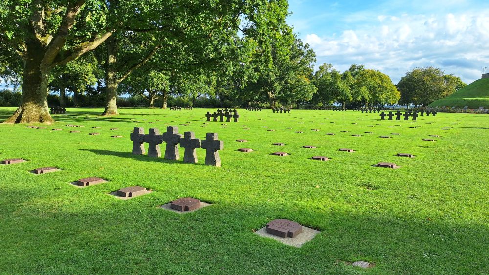 La fel trebuie să fi fost și cu soldații germani, căci undeva mai la sud de Omaha beach este cimitirul german de La Cambe. La origine se pare că și aici tot americani fuseseră îngropați, de aia organizarea și rigoarea dispunerii crucilor e similară cu aia din cimitirul american. Dar la reorganizare au fost grupați toți americanii la Omaha, și aici i-au lăsat pe germani. Au avut grijă ca micile pietre funerare să fie de culoare închisă, ca să se știe clar că ăștia erau ăia răi. La intrarea în cimitir scrie ceva de genul că și ei sunt până la urmă niște victime, care merită cinstire. Probabil că majoritatea asta și sunt (după cifrele înscrise pe pietre unii abia ieșiseră din adolescență), minus ăia câteva sute sau o mie dintre ei, care făcuseră parte din SS. Poate că ăia n-au fost chiar așa victime.