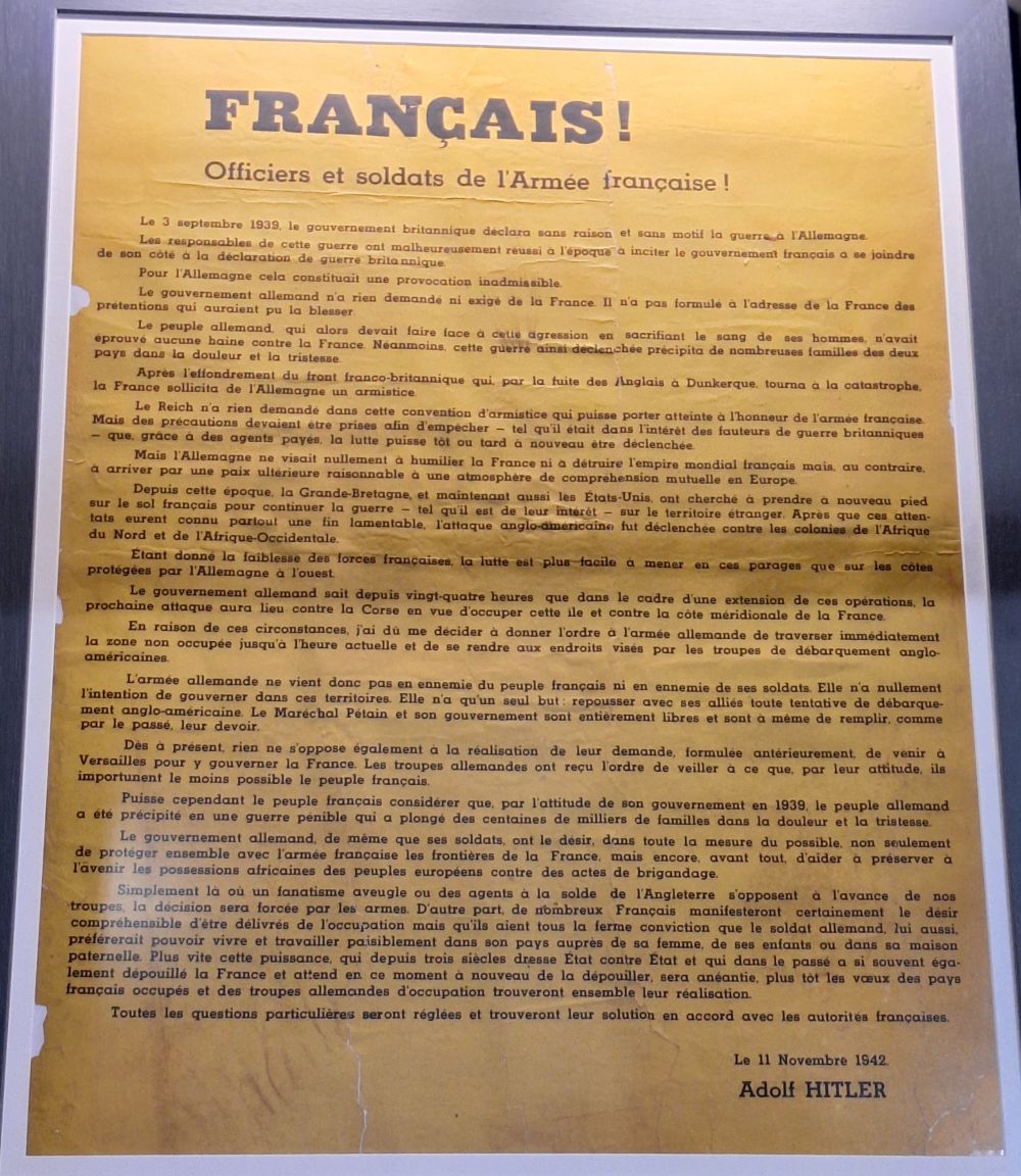 Armata germană nu vine deci ca dușman al poporului francez și nici ca dușman al soldaților săi. Nu are nicio intenție de a guverna în aceste teritorii. Are un singur scop: să respingă împreună cu aliații săi orice încercare de debarcare anglo-americană. Mareșalul Pétain și guvernul său sunt complet liberi și sunt în măsură să își îndeplinească, ca și înainte, datoria.