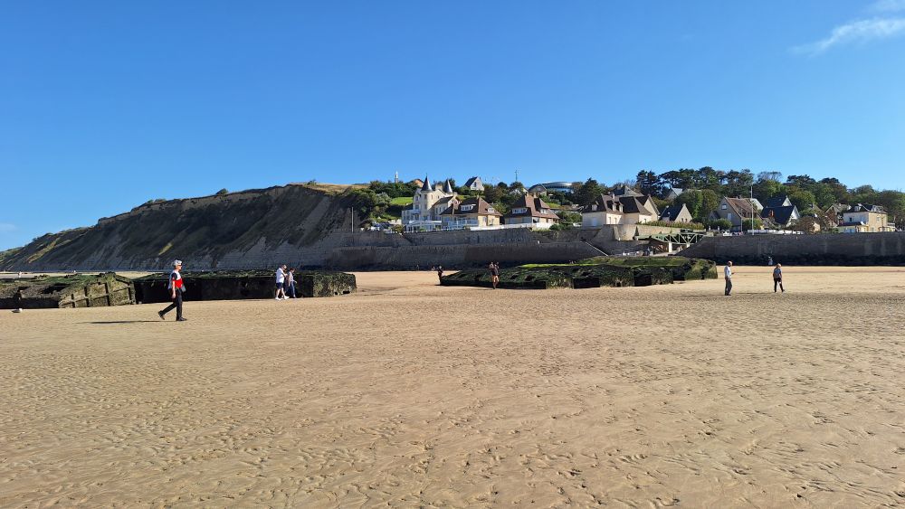 La plaja englezilor, în afara pontoanelor eșuate pe țărm mai este construit un soi de monument cu niște stâlpi pe care sunt scrise numele soldaților englezi căzuți acolo. Pare ceva mult mai puțin spectaculos și probabil mai ieftin decât efortul depus de americani.