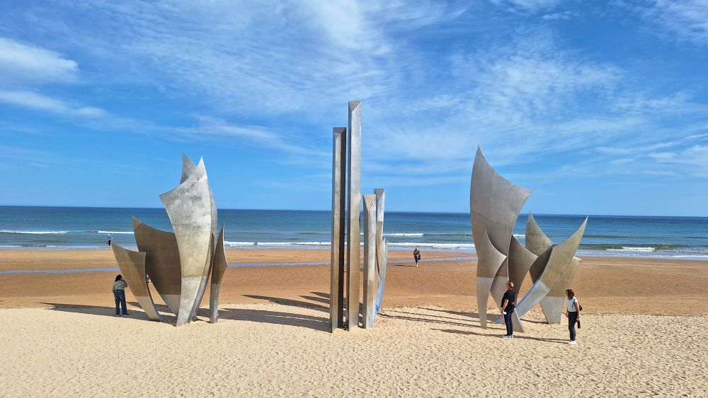 La Omaha, însă, ai pe de-o parte monumenul standard, dar mai ai și un monument pus chiar pe plajă, în nisip, unde sunt înfipți niște colți din inox, care simbolizează evident apărarea germană sau poate aripile de înger ale celor căzuți acolo. Apoi este celebrul cimitir american și muzeul, unde probabil orice vizitator simte fiori pe șira spinării la vederea acelor mii de cruci albe, identice, plantate în iarba verde tunsă la milimetru, la aceeași distanță, perfect aliniate precum rândurile de vie din Champagne.