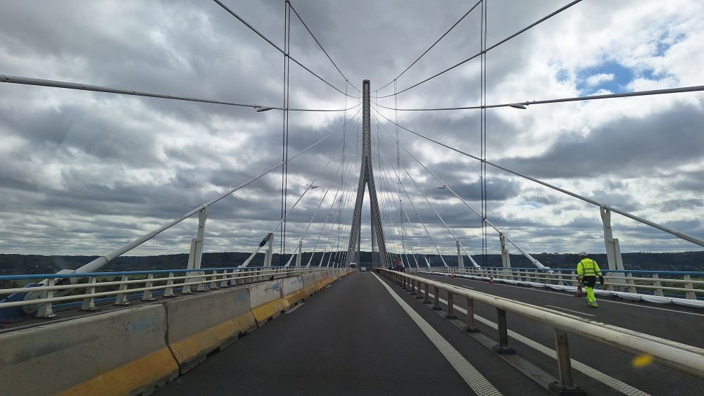 La plecare am luat-o pe mal în jos, prin Honfleur, Deauville, Cabourg, urmând să înoptăm în Caen, și cu ocazia asta am trecut Sena (care se vărsa în ocean), peste ditamai podul cu hobane, Pont de Normandie, care are peste 2000 de metri lungime.