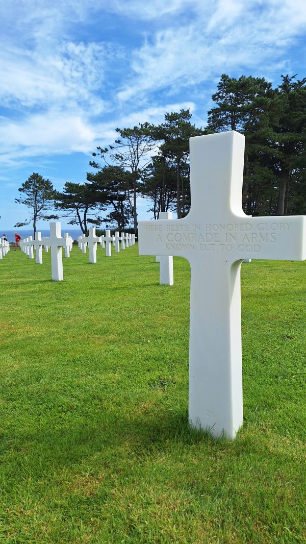 În liniștea aia, printre cruci, calcă smeriți o mulțime de turiști, în special în vârstă, americani, pătrunși cu adevărat de recunoștința pe care o vezi doar în filmele americane și crezi că e de paradă. Din ce am văzut eu acolo nu pare să fie de paradă. Adică erau mulți americani veniți special ca să vadă locurile unde bunicii sau diverse rude de-ale lor au luptat pentru Europa. Și asta e impresionant.