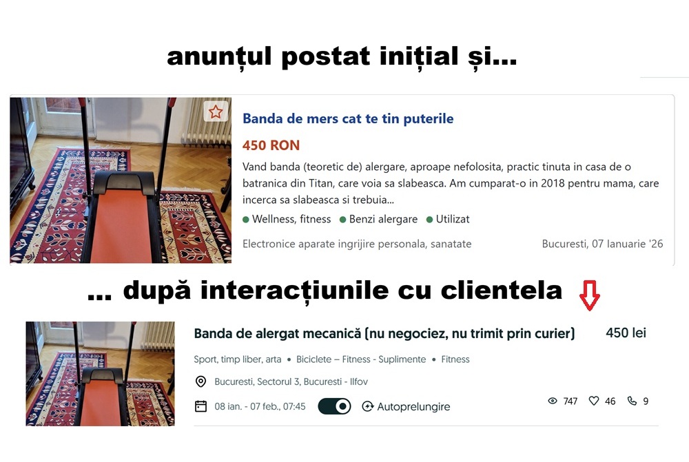 Când am ajuns acasă am modificat anunțul și am șters toate figurile de stil cu care speram să dau pe spate audiența. Am scris clar în titlu: Bandă de alergat mecanică (nu negociez, nu trimit prin curier). Are aia, aia, ține atâtea kg și e înclinată. Dacă aș fi putut aș fi scris cu majuscule și bolduit, dar nu permite site-ul.