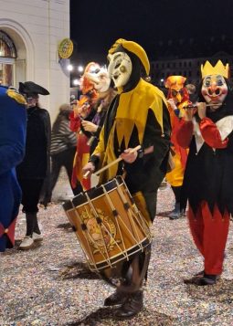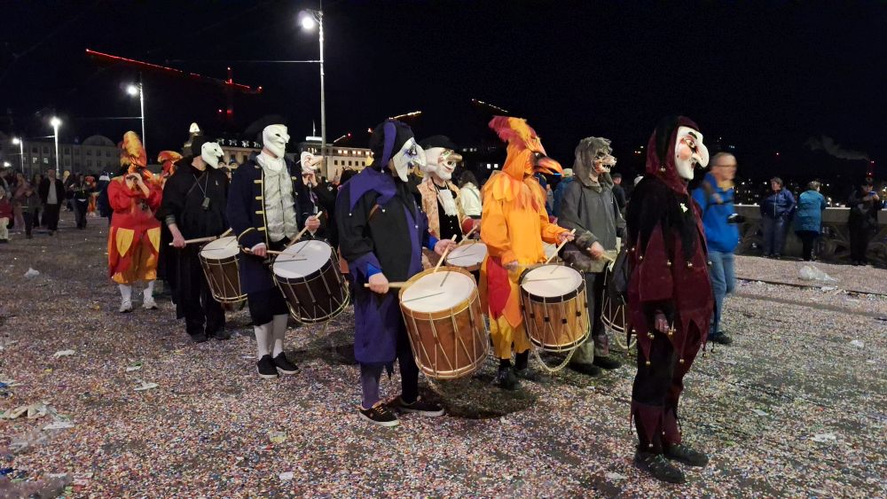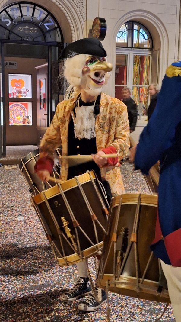 În carnavalul elvețian se petrec următoarele chestii: oamenii se organizează în clici (inițial erau bresle meșteșugărești, dar mai încoace sunt pur și simplu asociații unite de o viziune comună), se costumează cum le trece prin cap (dar destul de elaborat, inspirați de Commedia dell’Arte, culți ce mai…), apoi mărșăluiesc pe străzile orașului și cântă la diverse instrumente – de regulă flaut, trompete, tromboane, tobe.