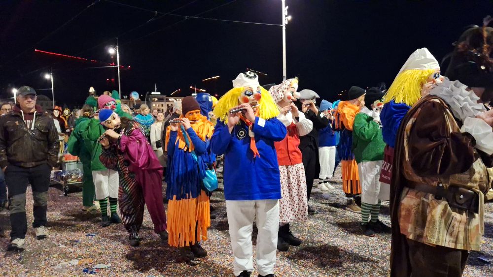 În timpul ăsta, împart și diverse cadouri oamenilor întâlniți în drum (bomboane, fructe, muțunachi de pluș, manifeste) sau îi bombardează cu confetti. Aparent e un balamuc în care niște costumați umblă langa pe străzile din centru și cântă fără oprire. Dar asta e doar o aparență, căci fiecare clică știe foarte bine ce traseu are, iar când se întâmplă de se intersectează cu alții se așteaptă civilizat să treacă fiecare.