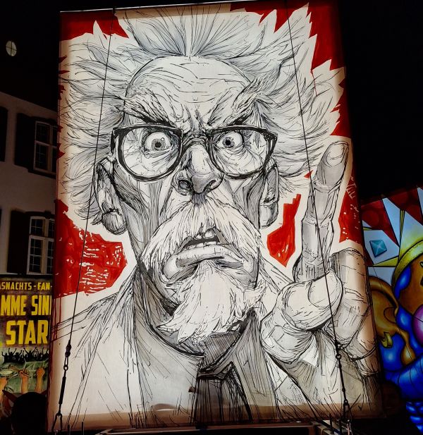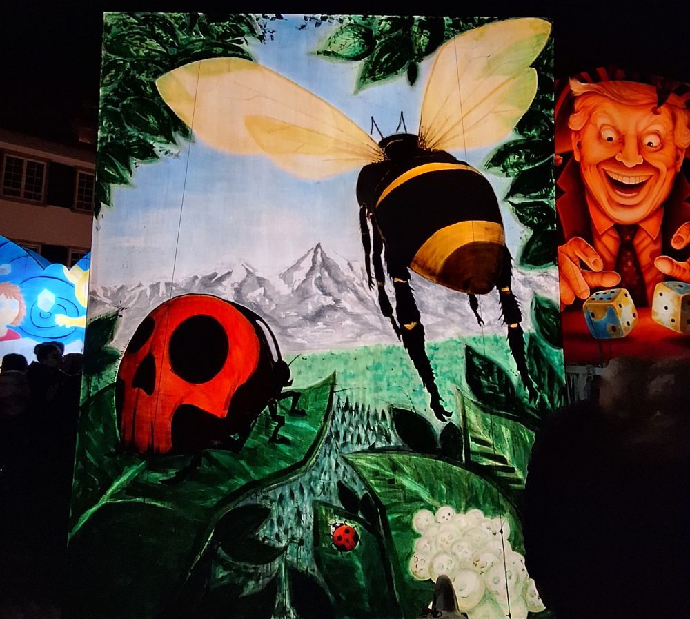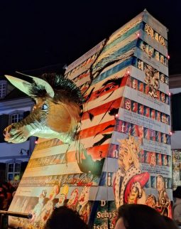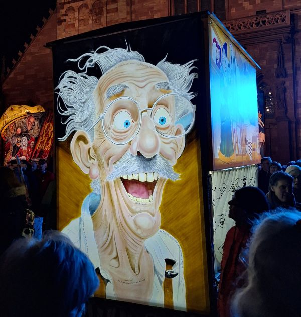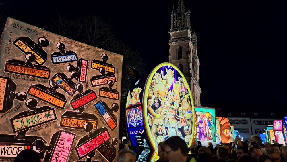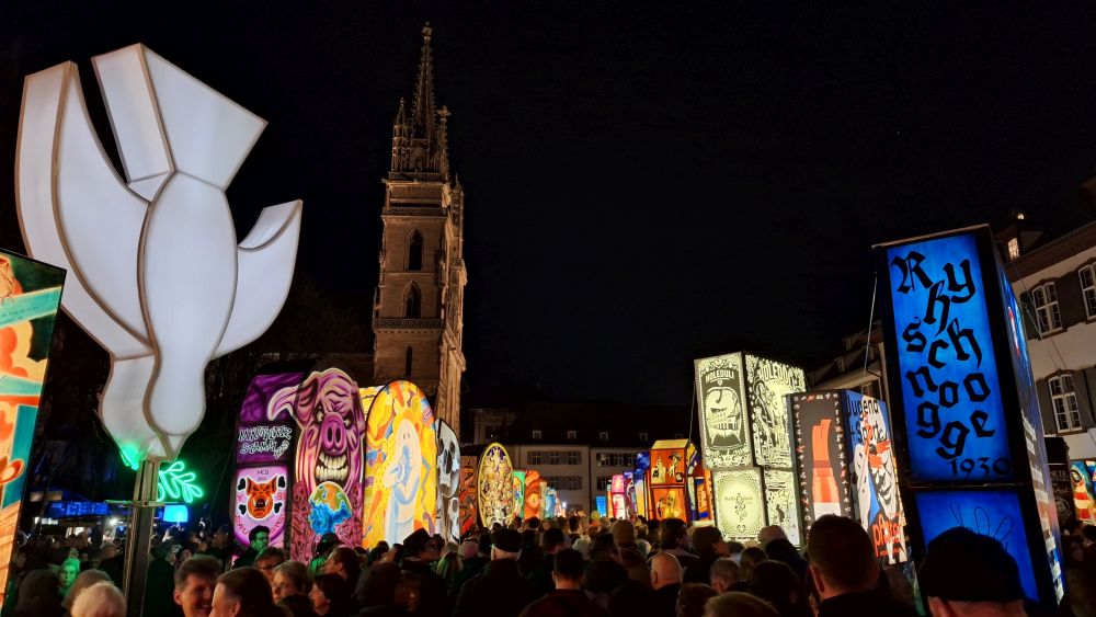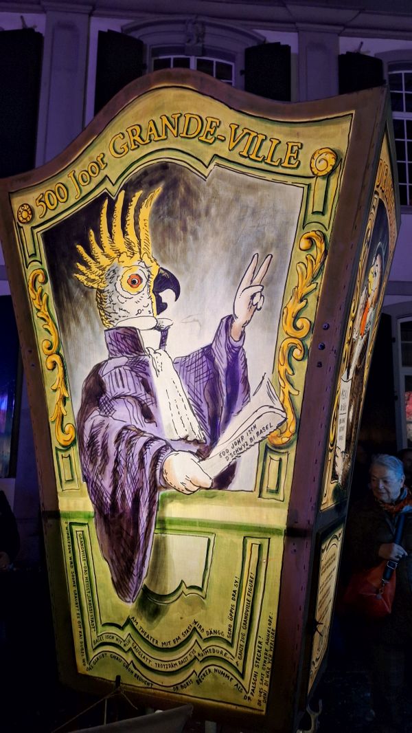 Startul carnavalului e dat la 4 dimineața când se sting toate luminile orașului și pe străzi apar clicile cu lanternele astea, purtate ca niște lectici și duse în final la expoziția care stă tot timpul carnavalului în piața Münsterplatz, unde e și ditamai catedrala orașului. Acolo am petrecut și noi câteva ore, zgâindu-ne cu gâtul în sus și capul pe spate, chinuindu-ne să pricepem ceva din mesajele alea ale lor în germana-elvețiană. Unele erau destul de evidente din desen, nu era nevoie să știi limba.