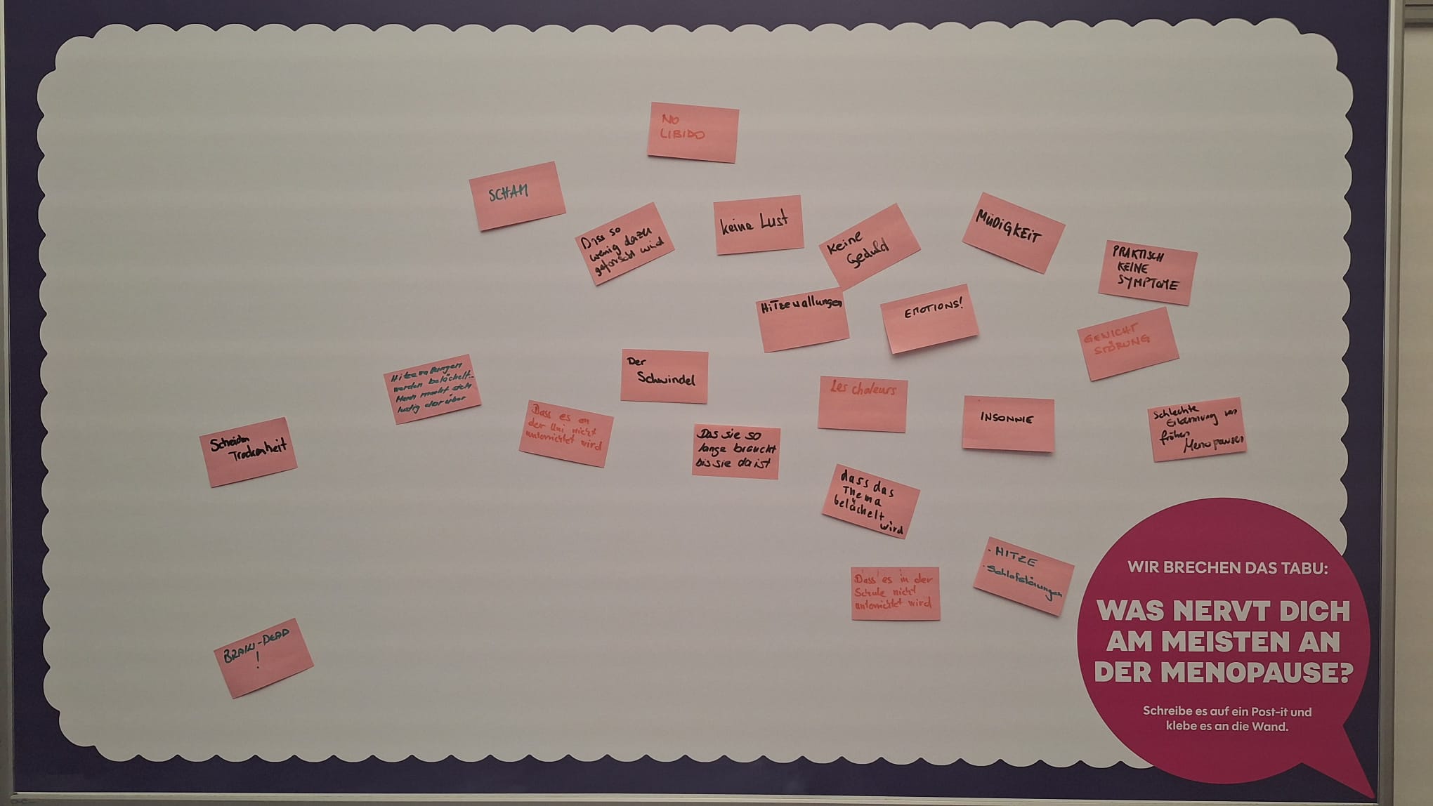 Apoi, în alte două camere, erau puse pe pereți informații despre „bolile” moderne de care suferim tot mai mulți dintre noi ăștia trecuți de anumite vârste: menopauza la femei și andropauza la bărbați. Simptome, cauze, și câte un panou pe care vizitatorii puteau să lipească post-it-uri cu propriile simptome sau enervări cauzate de a treia vârstă ingrată.